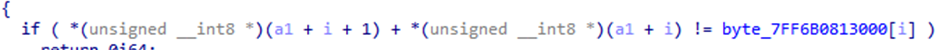 a[i+1] + a[i] = byte_7FF6B0813000[i]와 같아야 함을 확인할 수 있다.