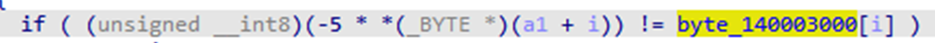 (a[i] * 0xFB & 0xFF == byte_140003000[i])