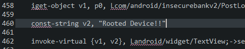 3. 수정 여부 판단 위해 PostLogin.smali 파일에서 Rooted Deviced 를 다른 문자로 수정