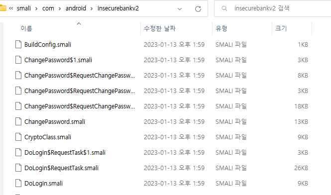 컴파일 하면 app\app-release\smali\com\android\insecurebankv2\에 smail 코드가 생성