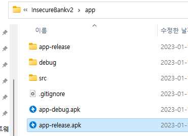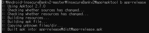 - 문자 수정해 생성된 apk 파일은 InsecureBankv2\app\app\release\dist\에 존재