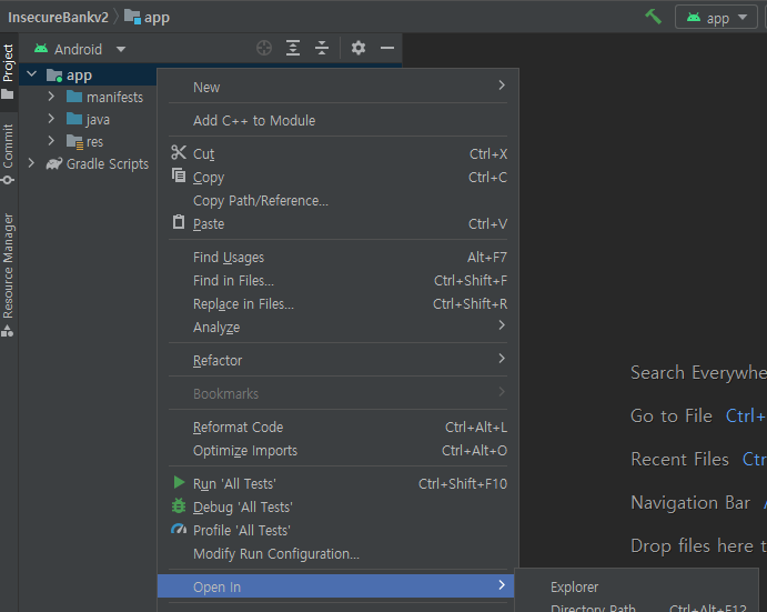 1. 안드로이드 스튜디오에 인시큐어뱅크 프로젝트를 불러옴