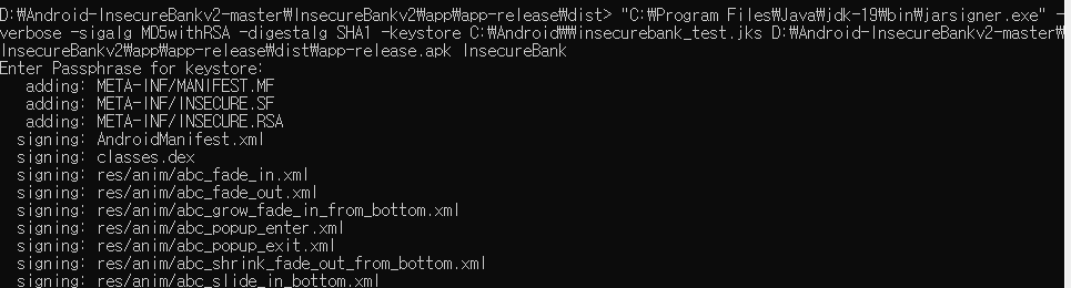 "C:\Program Files\Java\jdk-19\bin\jarsigner.exe" -verbose -sigalg MD5withRSA -digestalg SHA1 -keystore C:\Android\insecurebank_test.jks D:\Android-InsecureBankv2-master\InsecureBankv2\app\app-release\dist\app-release.apk InsecureBank