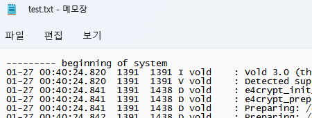 - 이벤트 로그 : # logcat -b events -v threadtime -d *.v