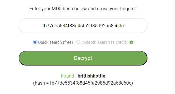 MD5로 복호화를 하니 brittishhottie라는 문자열이 나왔다.